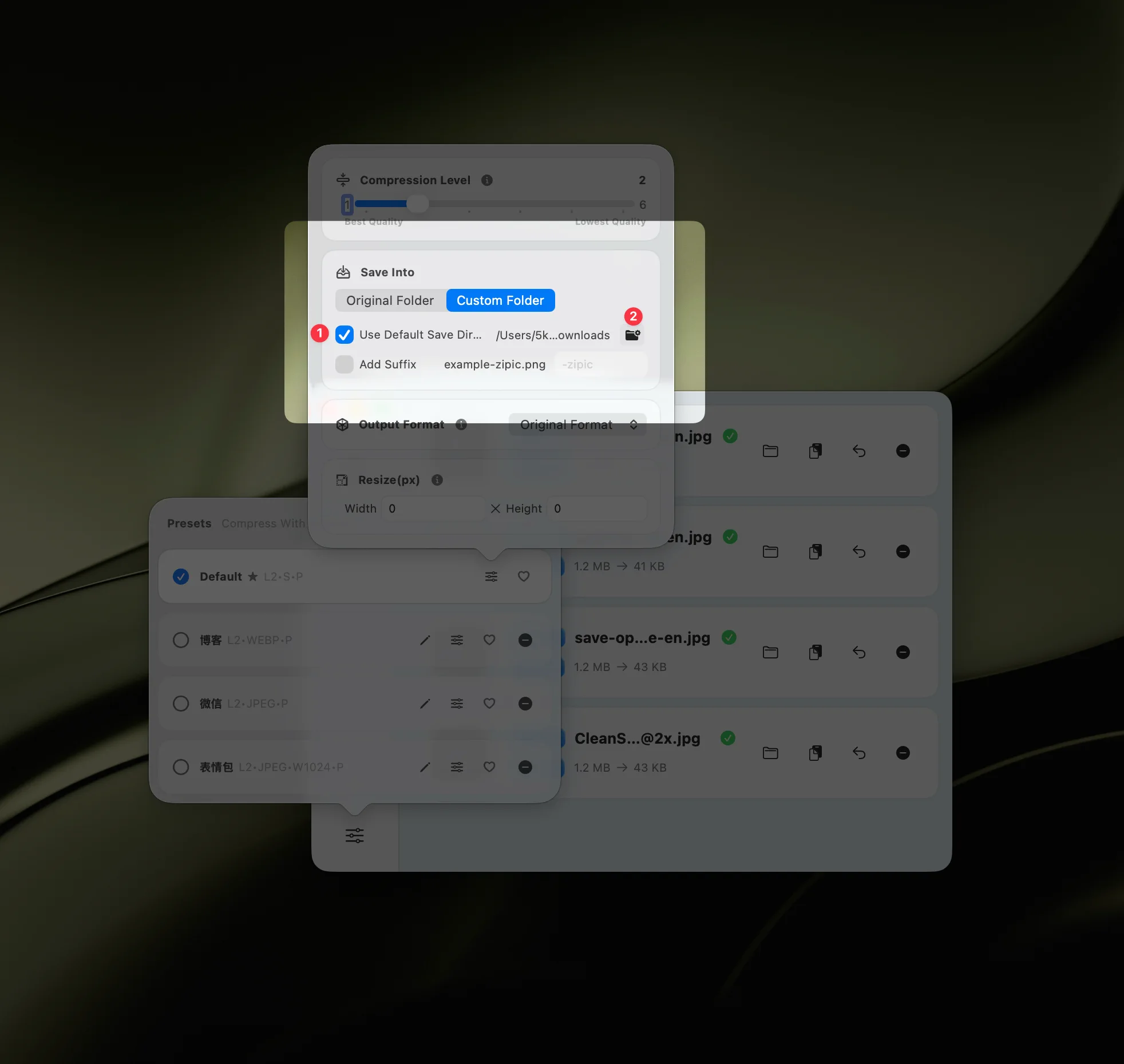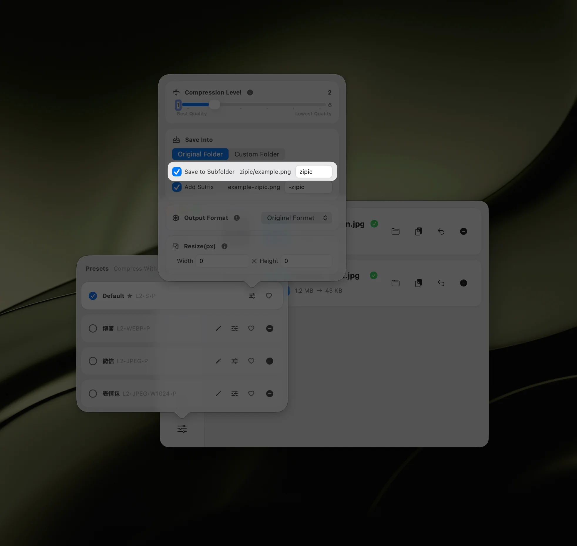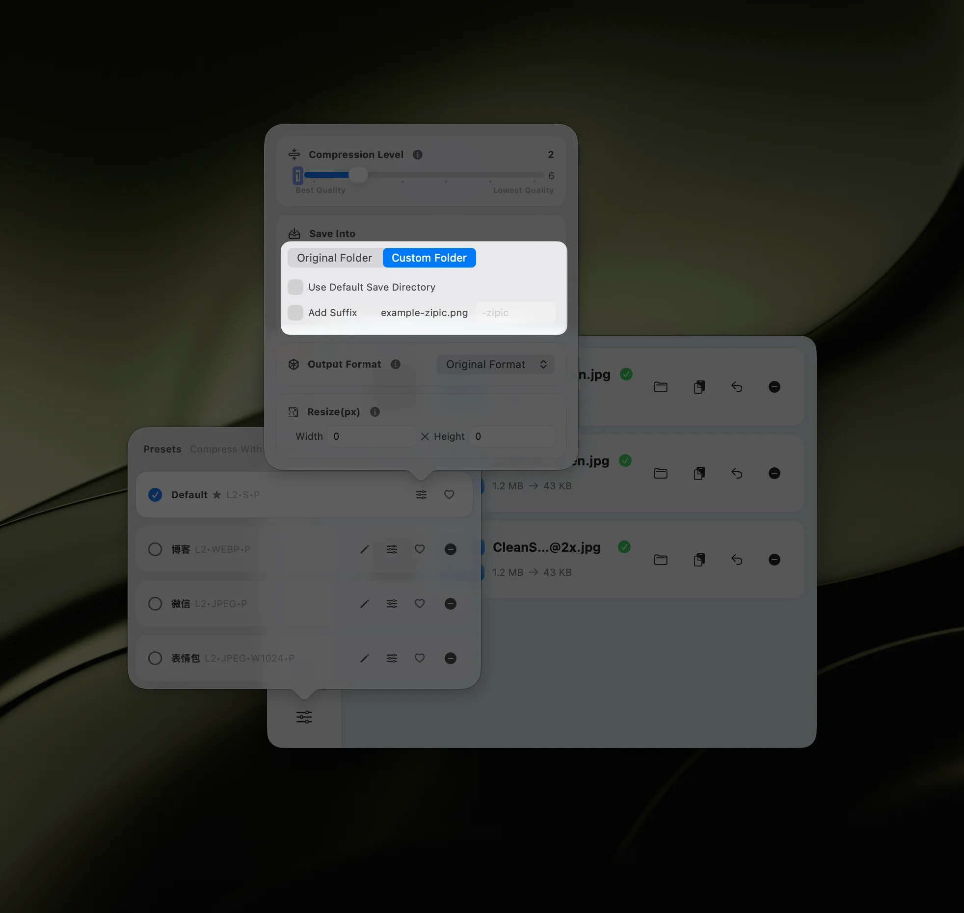 Zipic offers various save options for images, divided into Original Folder and Custom Folder.