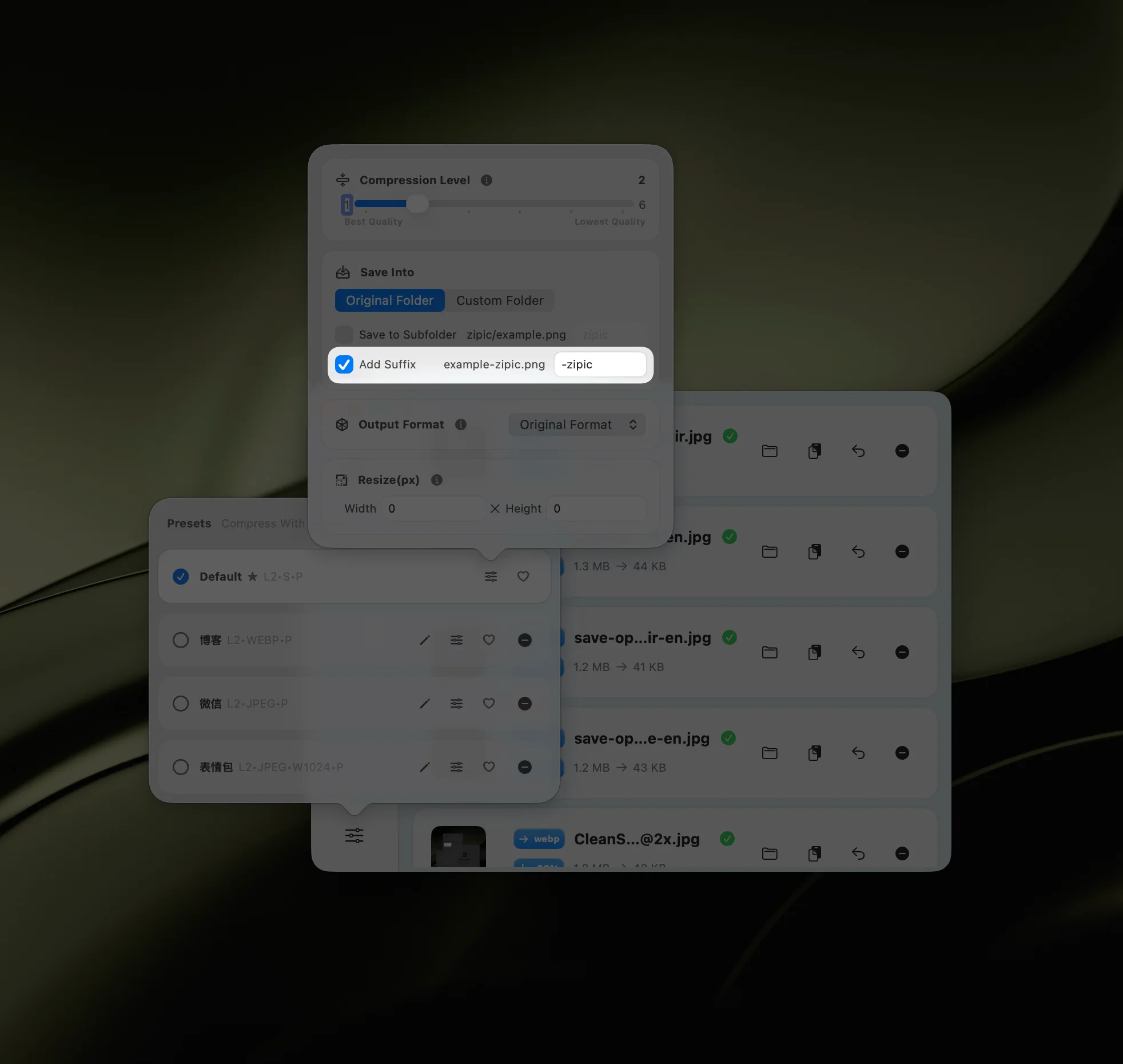 Both Original Folder and Custom Folder options allow you to add a suffix to the filenames. Enter the desired suffix in the input box to save compressed images with this suffix.